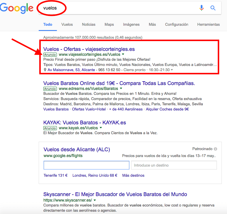 Ejemplo: Cuando buscas algo en Google y ves los resultados que dicen “Anuncio”, esos son resultados SEM.