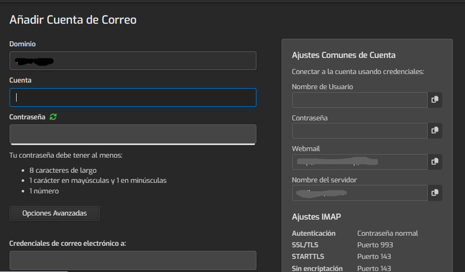 5. Ahora vas a rellenar todos los campos, el "Campo" será lo que quieres antes del @tudominio, por ejemplo, hola, info, contacto.... Coloca una contraseña segura, podrás elegir una aleatoria o personalizada.